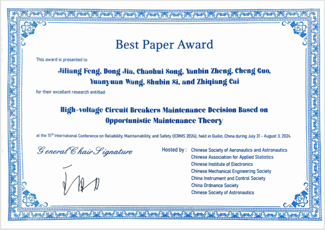 蔡志强教授课题组硕士生贾栋的论文《High-voltage Circuit Breakers Maintenance Decision Based on Opportunistic Maintenance Theory》荣获IEEE ICRMS国际会议“最佳论文奖”。