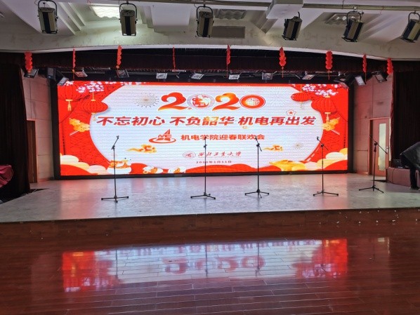 在健翔楼举办了一年一度的教职工迎新春联欢会,五楼多功能大厅大型LED屏上绚丽的显示出今年联欢会的主题是“不忘初心,不负韶华,机电再出发”。会场被布置得的错落有致,充满了欢乐、喜庆的气氛。学院工会的工作人员在入口处热情地欢迎学院的教职员工,并为大家发放进门礼和抽奖奖券。