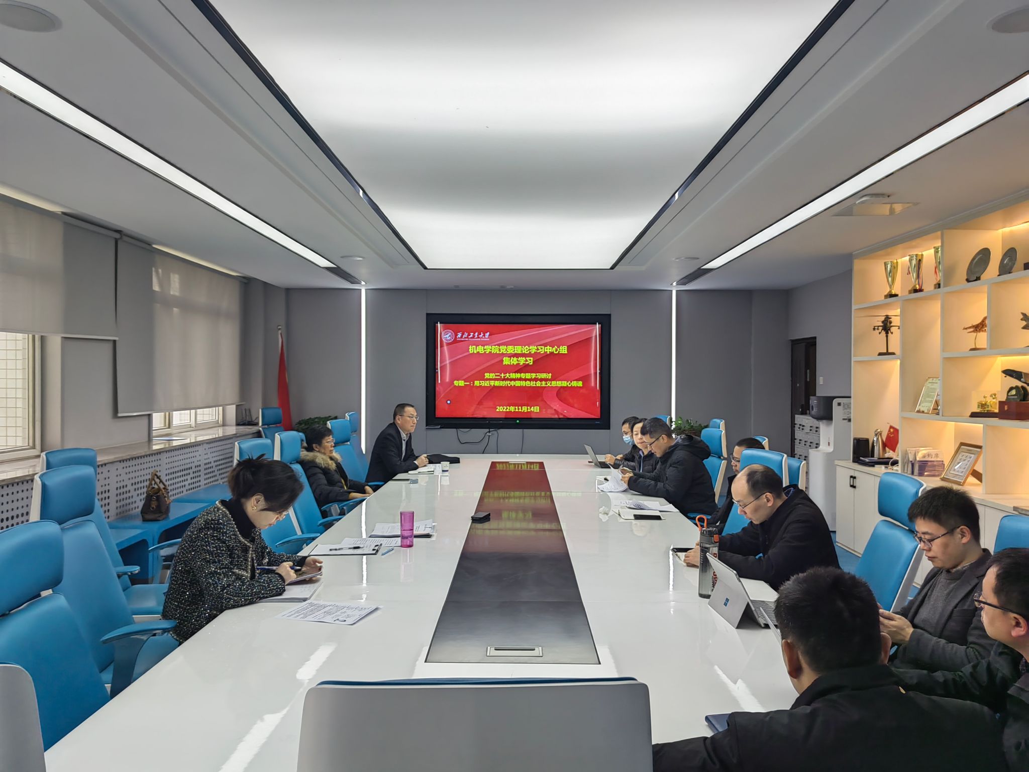 党委于航空楼B416开展理论学习中心组专题研讨会,本次会议主题为“用习近平新时代中国特色社会主义思想凝心铸魂(专题一)”,会议由党委书记张映锋主持,学院党委理论中心组学习成员及班子成员参加。