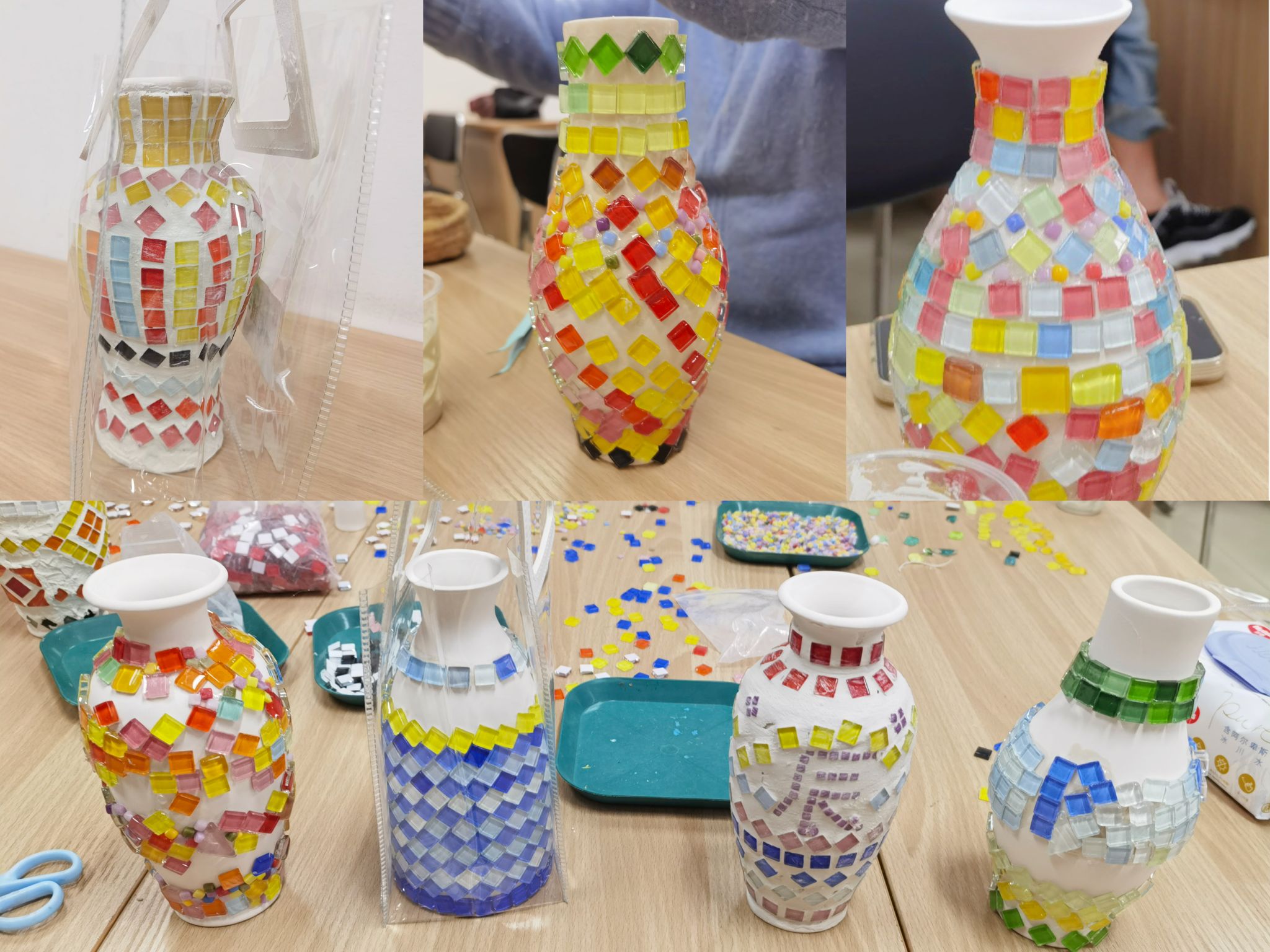 刘书暖老师代表学院工会向现场的女教职工们送上了节日的祝福,希望大家在这个轻松温暖的午后享受手工制作的过程,感受创作带来的乐趣,进一步丰富精神文化生活。随后,在专业老师的讲解下,大家既有奇思妙想,又有集思广益的大胆尝试,利用不同大小、形状和颜色的马赛克拼贴出自己喜欢的花瓶图案。经过一个多小时的亲手实践,一个个充满想象力的作品呈现在眼前,看着自己专属的独一无二的艺术品,每个人都收获了满满的幸福和快乐。