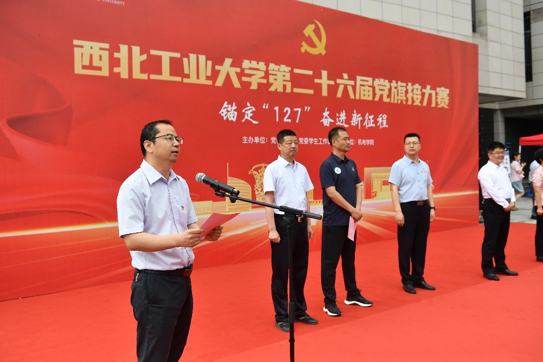 杨晓代表学校党委致辞,向参加比赛的各位同学、老师表示热烈的欢迎,向辛勤工作的裁判员、志愿者和工作人员表示衷心的感谢。他指出,党旗接力赛是西工大的特色活动,以党旗接力的形式,象征党的优秀传统代代相传,近些年来活动的影响力显著提升。他希望本届党旗接力赛各参赛队伍能够团结协作,共同支持,磨练意志,赛出风格,赛出风采,为实现学校近期“127目标”和“天下工大、世界三航”的远景目标努力奋斗,为强国复兴贡献西工大力量。