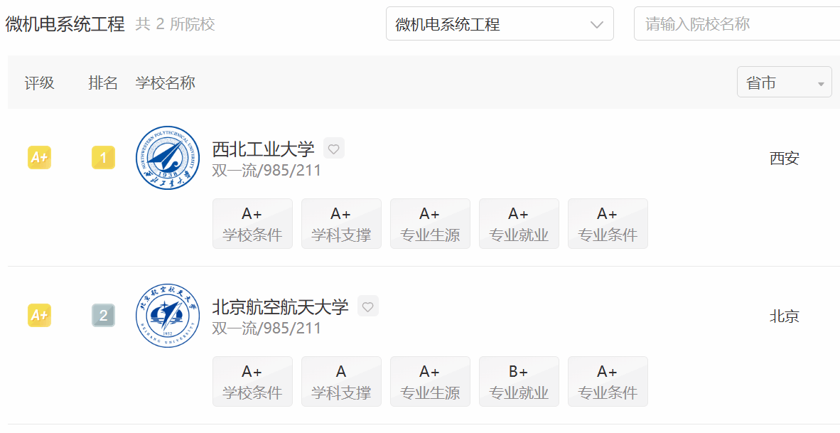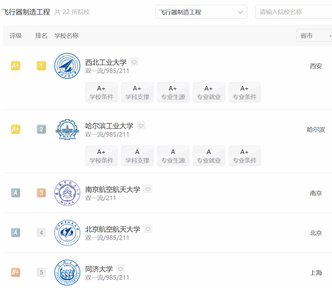 7个本科专业表现出色,全部进入了全国前10。其中,飞行器制造工程排名第1,微机电系统工程排名第1,机械设计制造及其自动化排名第4,机械电子工程排名第4,工业设计排名第7,产品设计排名第8,工业工程排名第10。其中,微机电系统工程从上一轮第2名升至第1名,产品设计从上一轮第28名升至第8名。