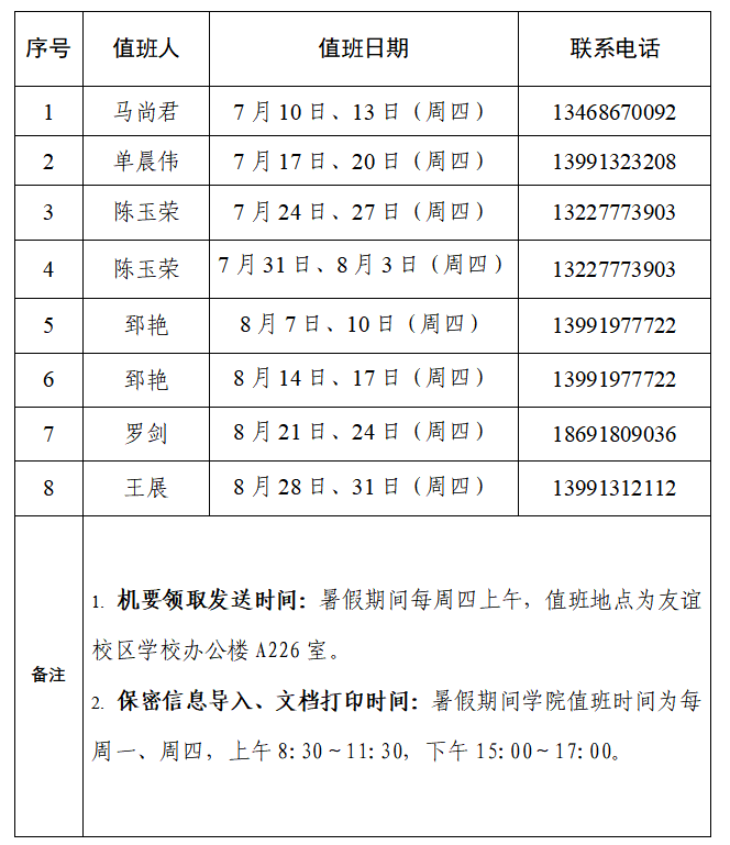 成人直播 2022-2023学年暑假保密机要值班表
