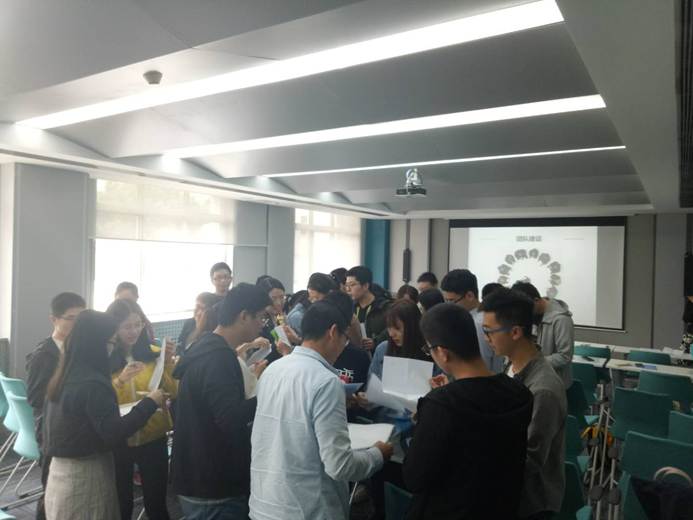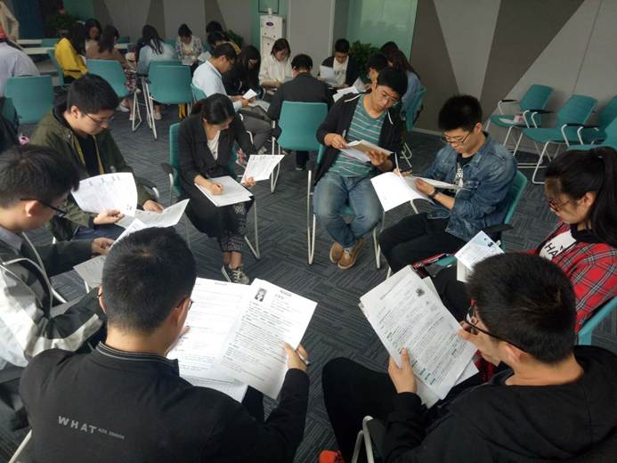首先朱莉老师组织每位同学将一张A4纸分成四个区域,分别写上自己的兴趣爱好、生活工作中的能量来源、为什么来参加本次活动及想从本次活动中获得什么。然后让大家根据所写内容寻找志同道合之人,并据此将大家分成四个小组。采用简短的自我介绍的方式,让每个小组选出了一名组长,负责整个小组的简历整理和记录。在朱莉老师的指引下,以小组为单位进行了简历交换,让每一名同学对其他同学的简历进行打分、评价,并评选出本组最优与最差的简历,让每一名同学亲身体验HR的感觉,同时学习其他同学简历的优点,达到“见贤思齐焉,见不贤而内自省也”的目的。
