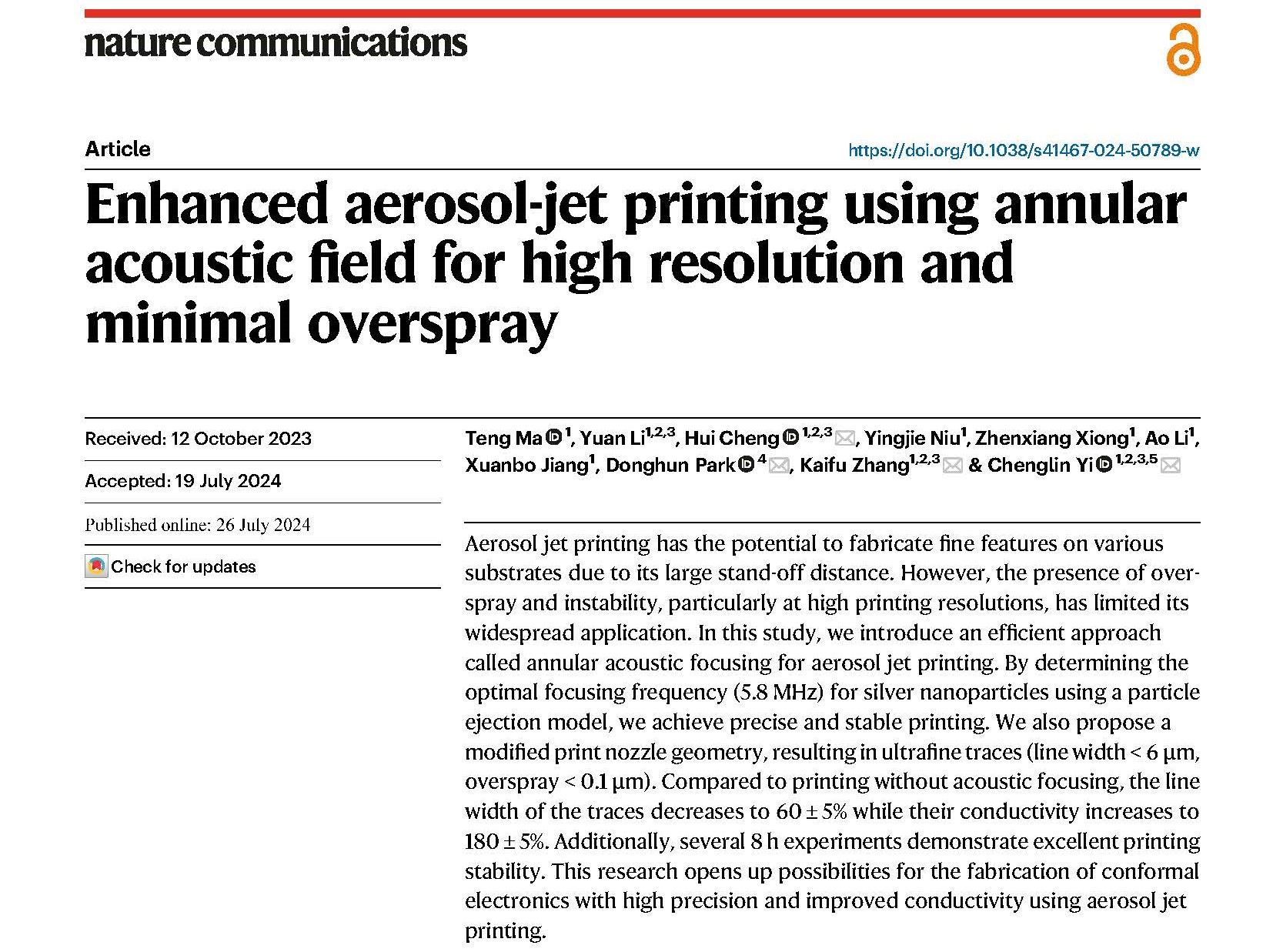 《Nature Communications》刊发西北工业大学成人直播 气溶胶喷墨打印研究成果