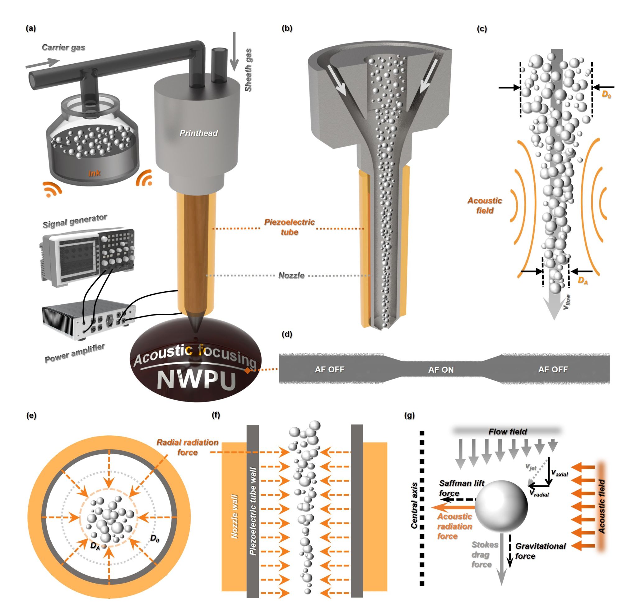 近日,西北工业大学张开富教授团队在气溶胶喷墨打印方向取得了新进展,成功发展了外加声场辅助聚焦的超高精度气溶胶喷墨共形打印策略,突破了行业的极限分辨率,在高精度、高集成共形电子制造领域具有重要应用潜力,研究成果以“Enhanced aerosol-jet printing using annular acoustic field for high resolution and minimal overspray”为题发表在Nature Communications(2024, 15, 6317)上。论文第一作者为博士研究生马腾,通讯作者为张开富教授、程晖教授和易城林教授。原文链接://doi.org/10.1038/s41467-024-50789-w