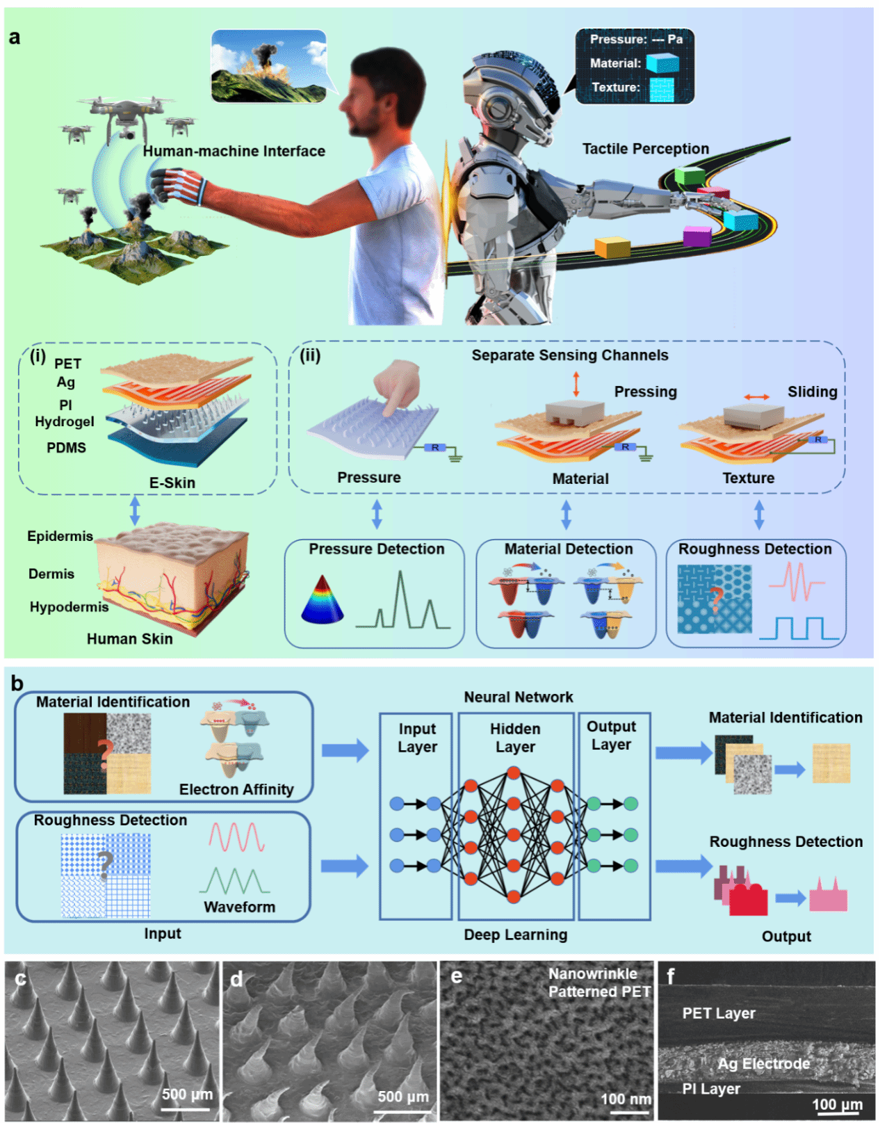 陶凯课题组提出了一种基于图案化水凝胶材料的多功能仿生电子皮肤(BHES),如图1所示。为模仿表皮层表面并更好地利用摩擦起电机制,引入了纳米褶皱图案化PET。同时采用微针图案化水凝胶作为摩擦层和导电电极,以提高器件的灵敏度。该电子皮肤具备高灵敏度压力传感、高准确率材料种类以及表面粗糙度识别等多种功能。结合信号采集/处理电路,可以通过该电子皮肤对人的手势进行检测,并用于进行无人机的三自由度运动操控以及无人机群的运动控制(图1)。
